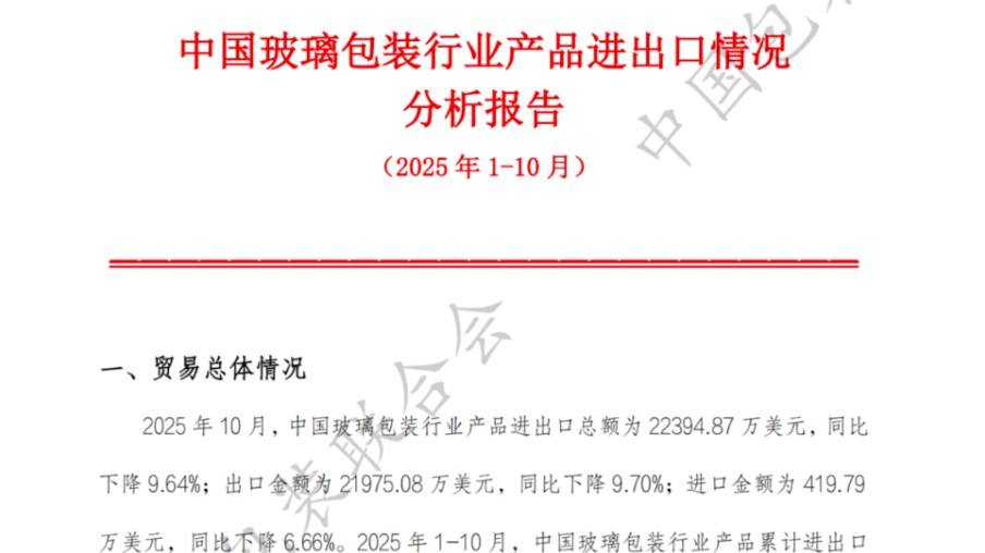 中国玻璃包装行业产品进出口情况分析报告(2025年1-10月)